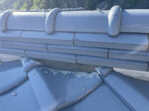 静岡県沼津市で和型瓦大棟の漆喰補修と鬼瓦接着シーリング工事です。今回は、漆喰補修と鬼瓦と大棟に空いてしまった隙間を埋める工事です。鬼瓦の落下の危険は無いと判断できたので、空いてしまった隙間に接着剤、シ